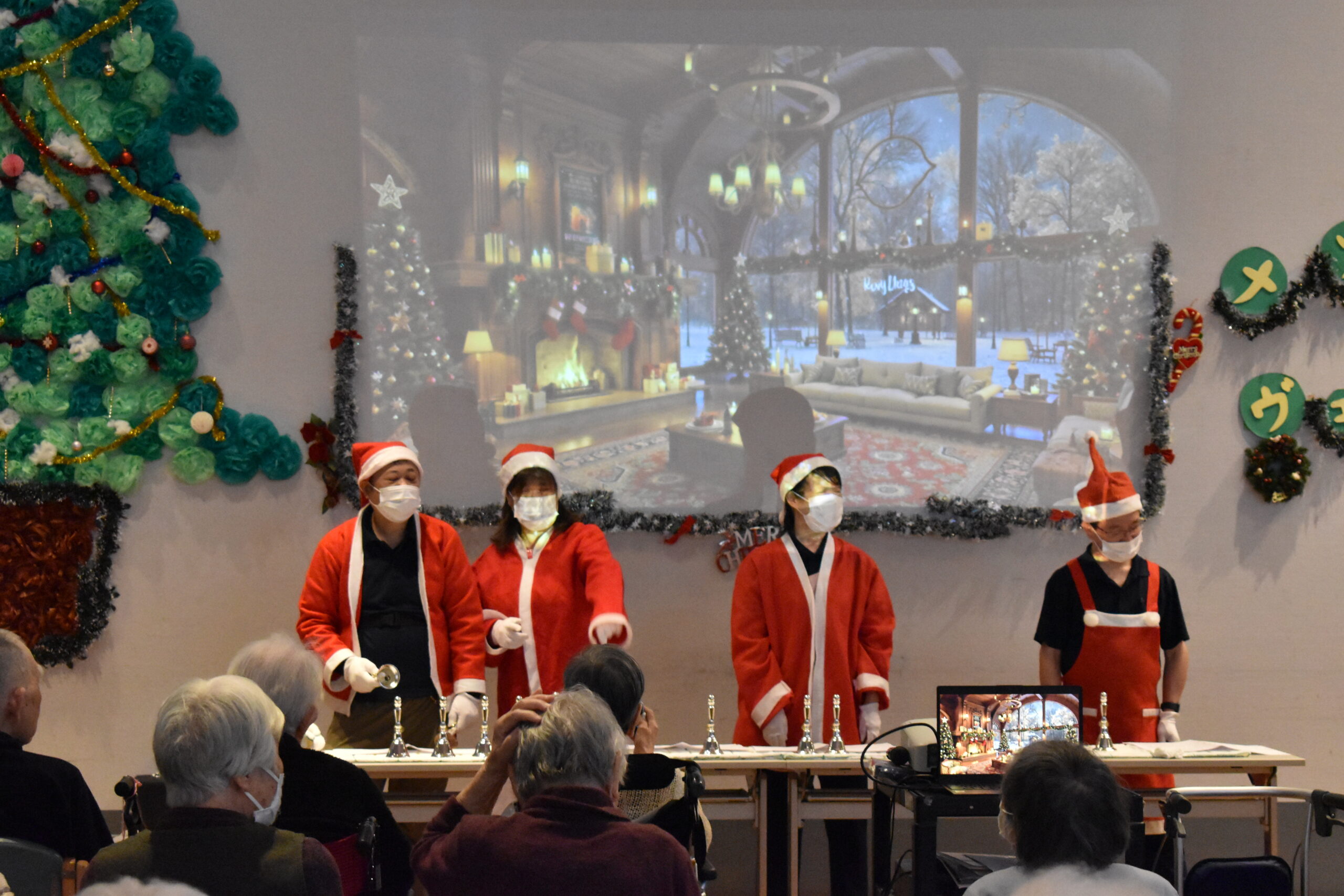 クリスマス会 2025年12月26日2025年12月21日 職員によるハンドベル演奏🎵「きよしこの夜」「ジングルベル」 2人羽織(お化粧編)を無事終えて「メリークリスマス🎅」 会場の皆様とクリスマスソング、「ブルーライトヨコハマ」、「津軽平野」を合唱♪ 入所のお客様全員に家族会からクリスマスプレゼントをいただきました。 おすすめの記事一覧新型コロナウイルス感染症に関するご報告(第八報)7月6日・夏祭り開催新型コロナウイルス感染症に関するご報告(第十報)鴨居ふくし祭り桃の節句お客様の義歯に名前が入りました