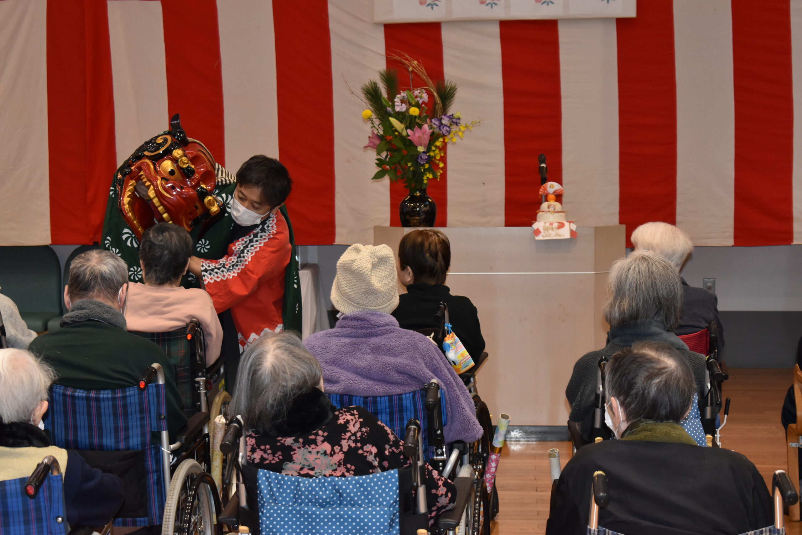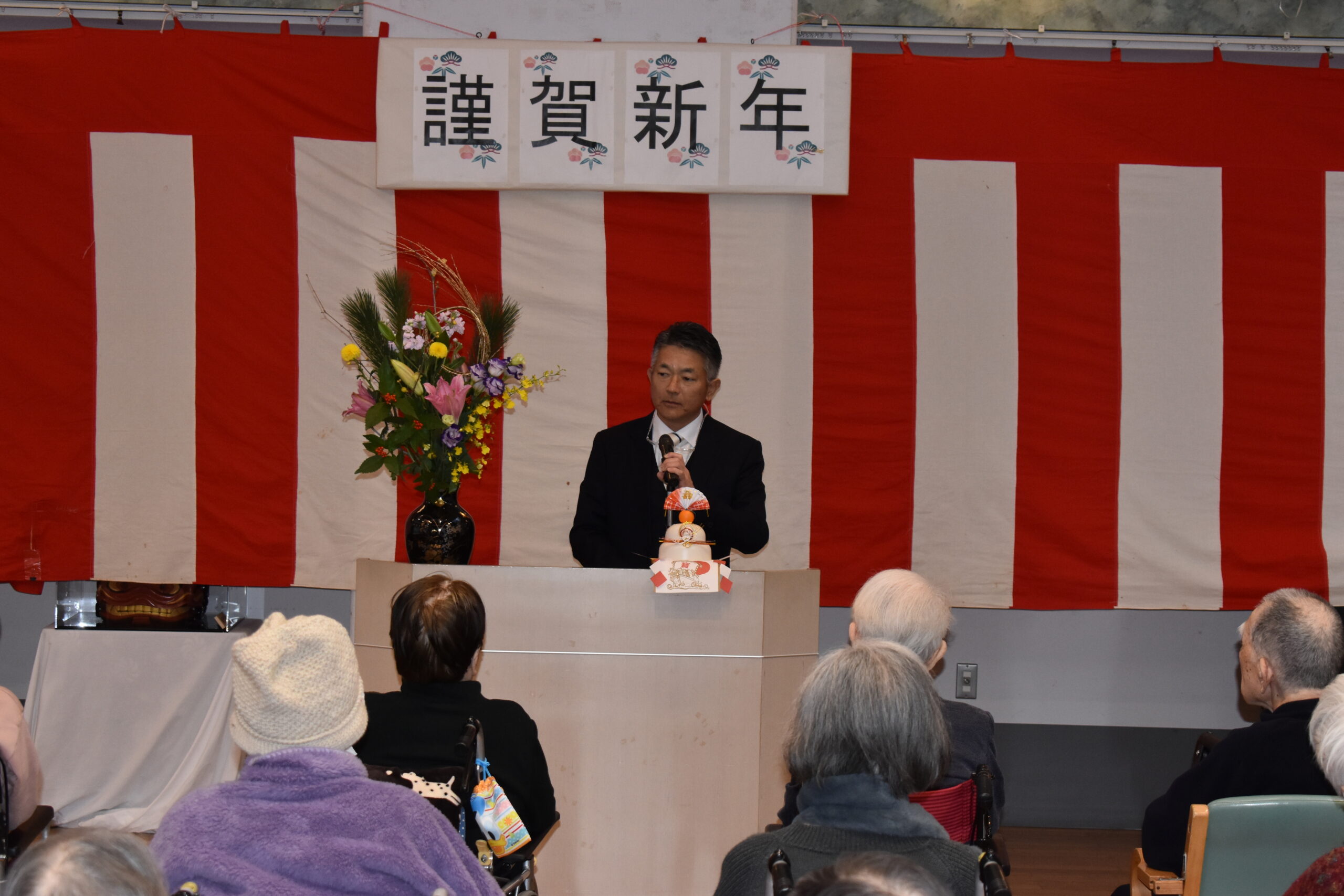 令和8年午年・新年祝賀会 2026年1月11日2026年1月1日 浅野倉栄理事長兼施設長より年頭のご挨拶 法人本部統括事務長よりご挨拶 獅子舞で邪気を祓い、参加者全員で「一月一日」、「富士山」を歌いお開きとしました。 おすすめの記事一覧新型コロナウイルス感染症に関するご報告(第七報)秋祭り5月5日お客様の義歯に名前が入りました今年も月下美人が咲きました新型コロナウイルス感染症に関するご報告(第三報)
